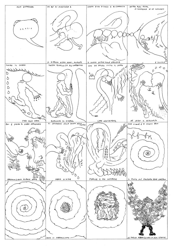 A occhi aperti, il festival che cura a Bologna Hamelin insieme a un gruppo di giovani artiste e artisti, si muove in questa direzione. Ha scelto un punto di vista specifico – quello del fumetto e del disegno contemporaneo – per interrogarsi su come questi linguaggi stiano rappresentando i tempi che viviamo. Ed è interessante perché anche dal punto di vista del fumetto si sta vivendo un momento di passaggio: la stagione del graphic novel, che era la novità di trenta-venti anni fa si è canonizzata, è certo capace di presentare ancora opere e personalità artistiche significative, ma non sembra più la forma privilegiata per esprimere una sintonia con la contemporaneità. A partire proprio dalla centralità dell’autore/autrice, che è stato il vero “gesto romanzesco” del graphic novel: l’atto di forza di esprimere una soggettività dichiarata (spesso anche autobiografica) che rendesse unica una data opera, usando un linguaggio che invece si era per lo più fondato sulla serialità e sulla produzione industriale. Quello che in parte scricchiola oggi è proprio l’approccio autoriale, inteso come affermazione dell’io che si pone come autore e narratore e in quanto tale capace e responsabile di condurre un racconto (non importa se autobiografico, reportage, di finzione) che abbia una sua linearità e una sua trama.